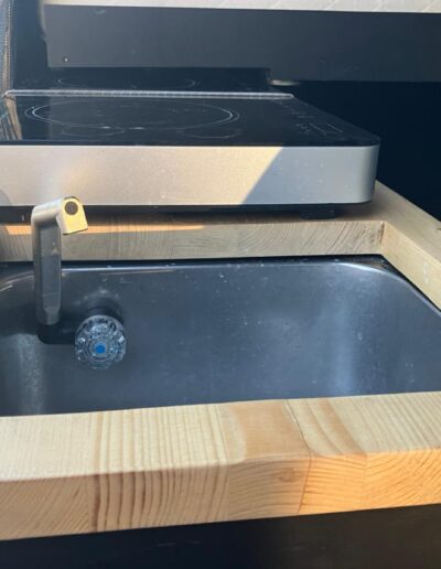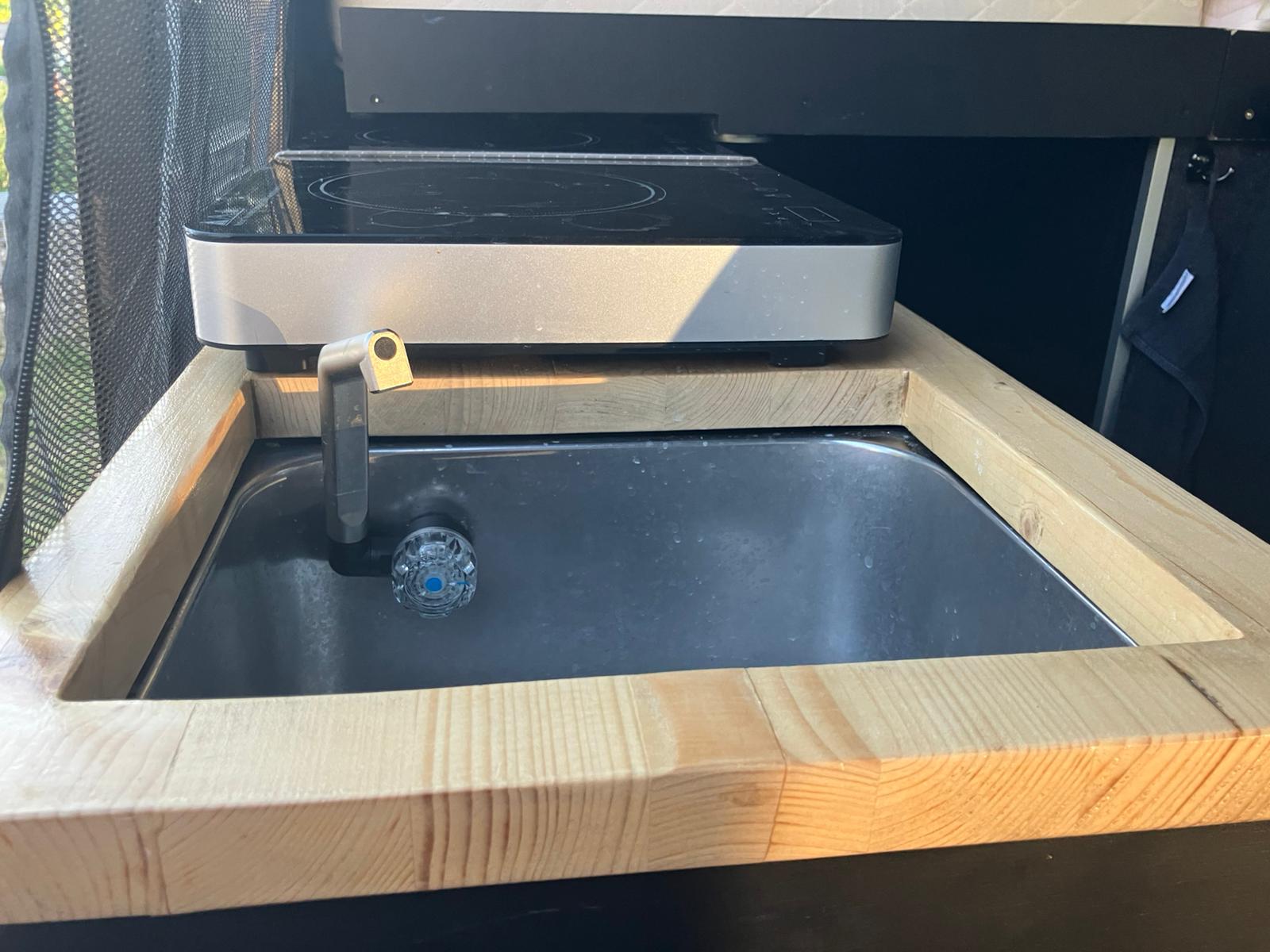 Inclusief compact keukenblok, opbergruimte en uitschuifbaar bed
